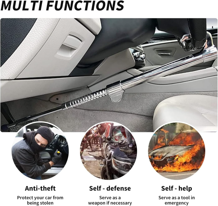 VERSATILE PROTECTION: Heavy-duty steering wheel lock that serves as both an anti-theft deterrent and emergency safety tool for your vehicle