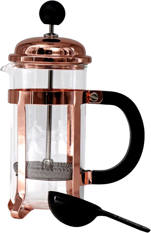 Copper framed coffee plunger Contemporary design, durable glass container Footed design for stability and sturdy handle Stylish and functional Easy to clean