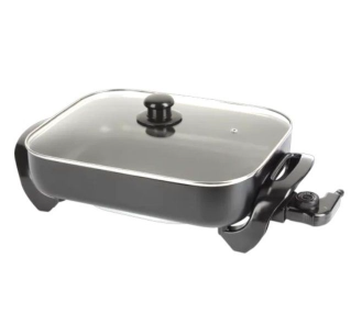 Electric frying pan with a handy turn knob, thermostat, and interior with a non-stick coating to make clean up quick and easy. Cover up your cooking with the included glass lid.