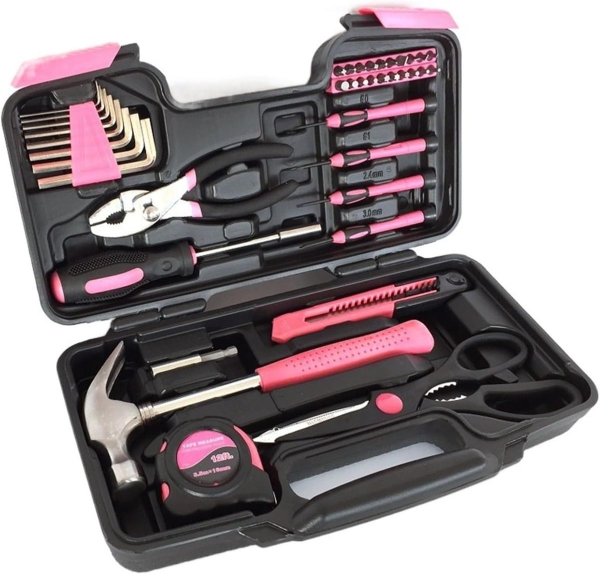 All in one convenient 39 pieces pink tool box set. Basic hardware tools that are a must ave for kitchens, college students, homes, office, etc. Tool are durable and made from steel and plastic, comes in an easy to carry hard plastic case. Makes for a good home gift for new home owners. Perfect for DIY lovers and handy man.