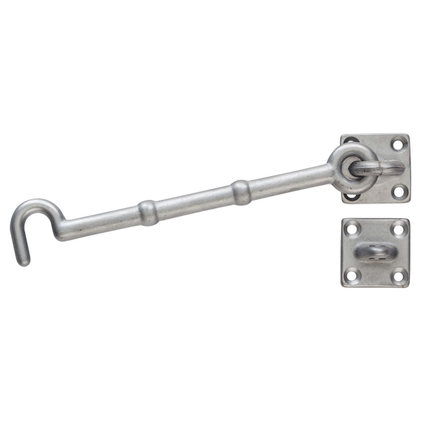 The QS cabin hook is a hooked bar that engages into a staple and is used to hold a cupboard, door or gate open. It can be fixed to the wall or door. The bar is attached permanently to a ring or staple that is fixed with screws or nails to woodwork or a wall at the same level as the eye screw.